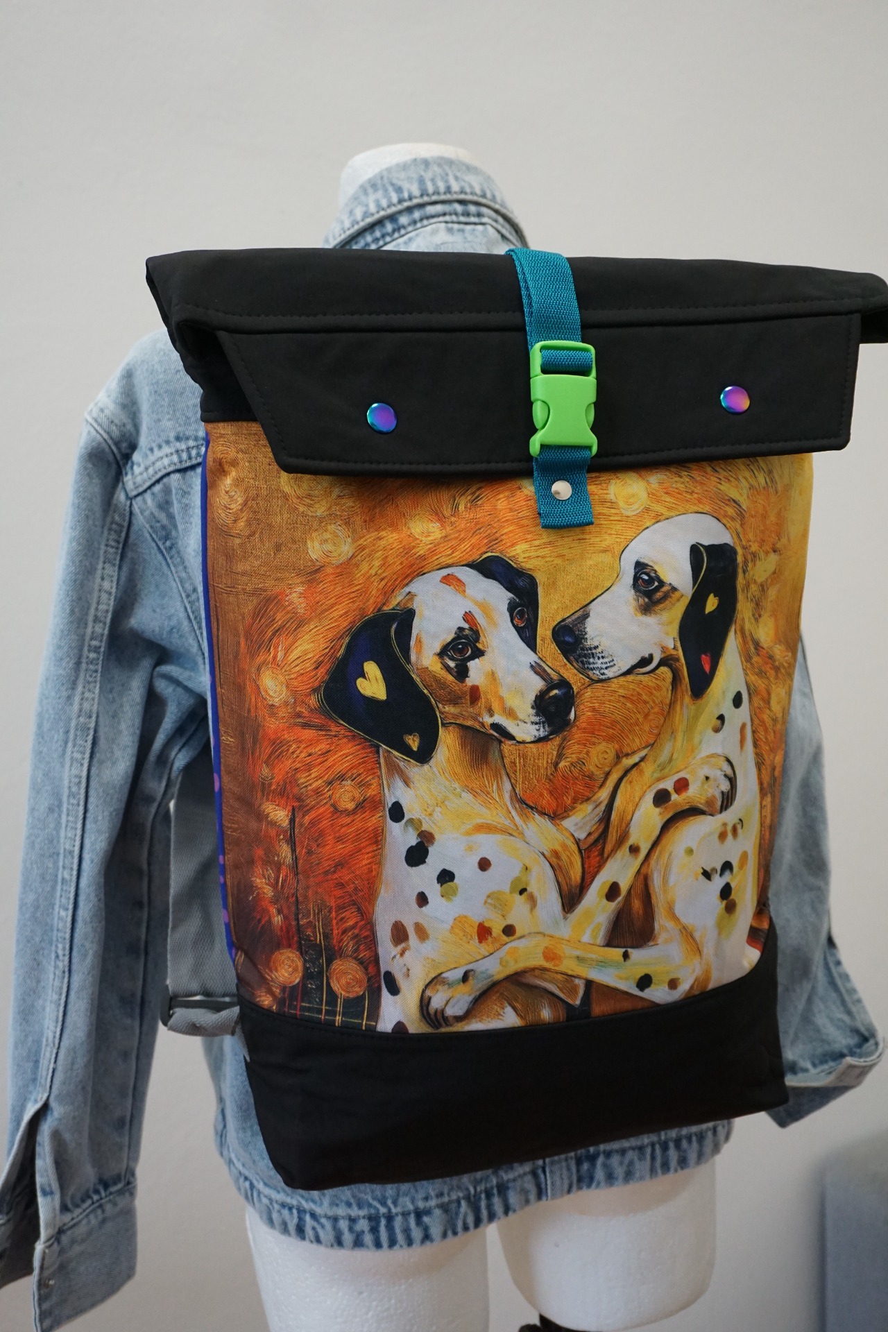 Materiál batohu je softshell v kombinácii s digitálne potlačenou syntetickou tkaninou (len predný diel, na ktorom sú dalmatínci). Základný materiál je softshell a to je príjemný, prispôsobivý materiál, ktorý drží tvar, ale zároveň je mäkký a aj sčasti nepremokavý. Popruhy na ramenách, sú tiež nastaviteľné a veľkosť je unisex. Sú polstrované. Drobnosti, ktoré chceš mať po ruke ukryješ do malého vrecka, ktoré je vo vnútri batohu a je uzatvárateľná na zips.