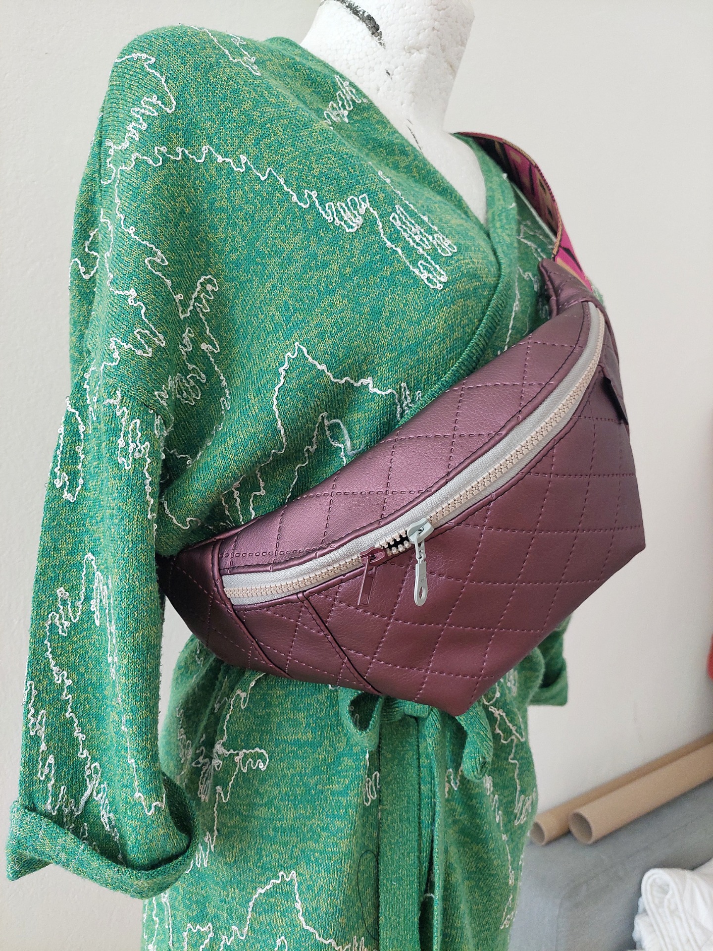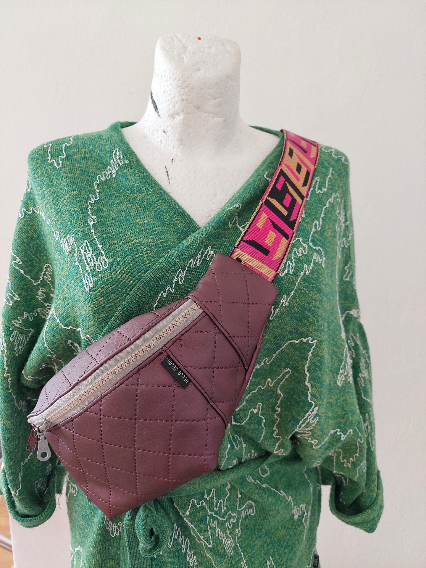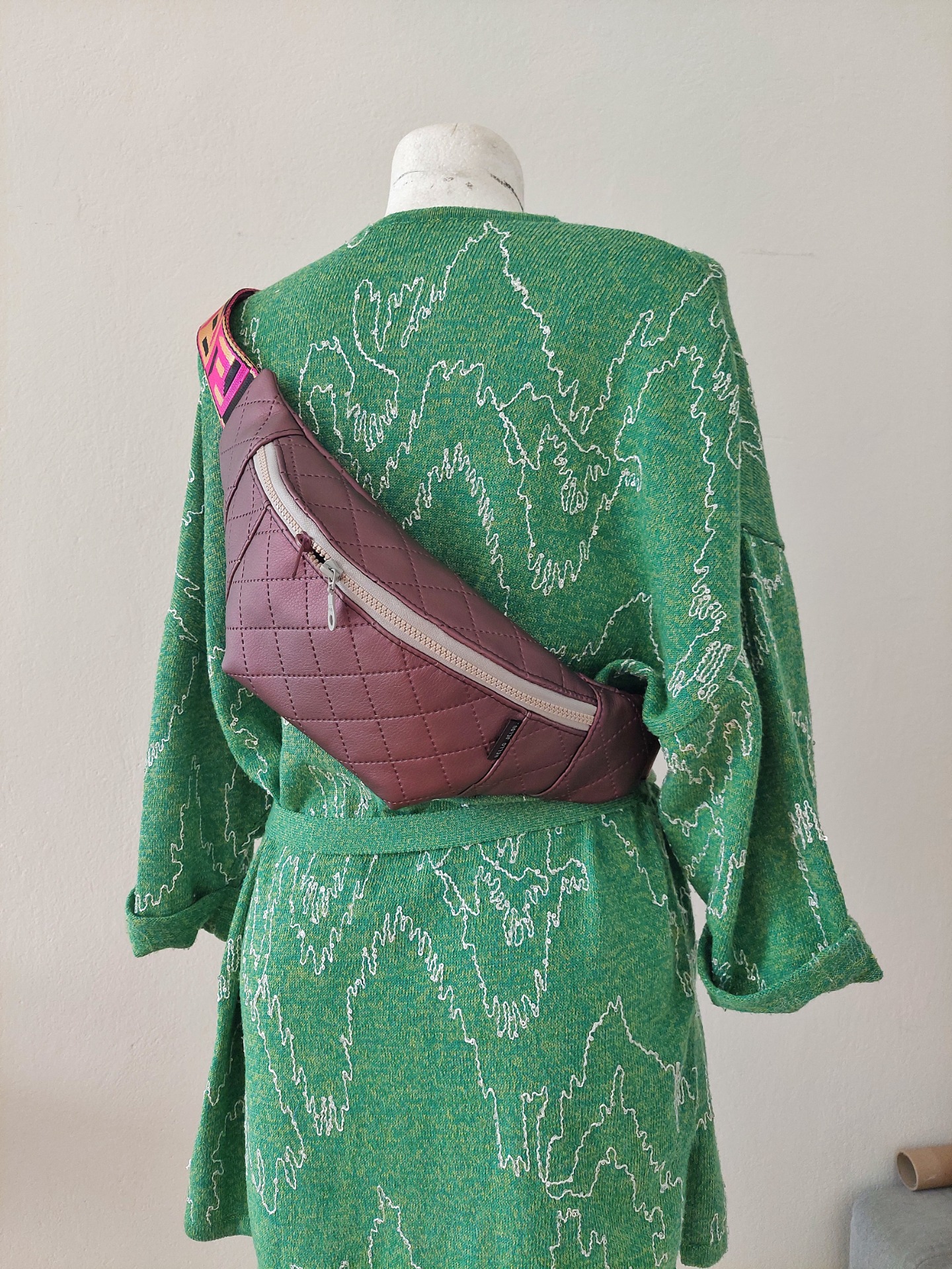 Ľadvinka je ušitá z koženky, jemne metalického odtieňa. Má jedno základné vrecko. Popruh je veľmi pevný, syntetický a má šírku 5 cm. Spona na popruhu je čierna, plastová.