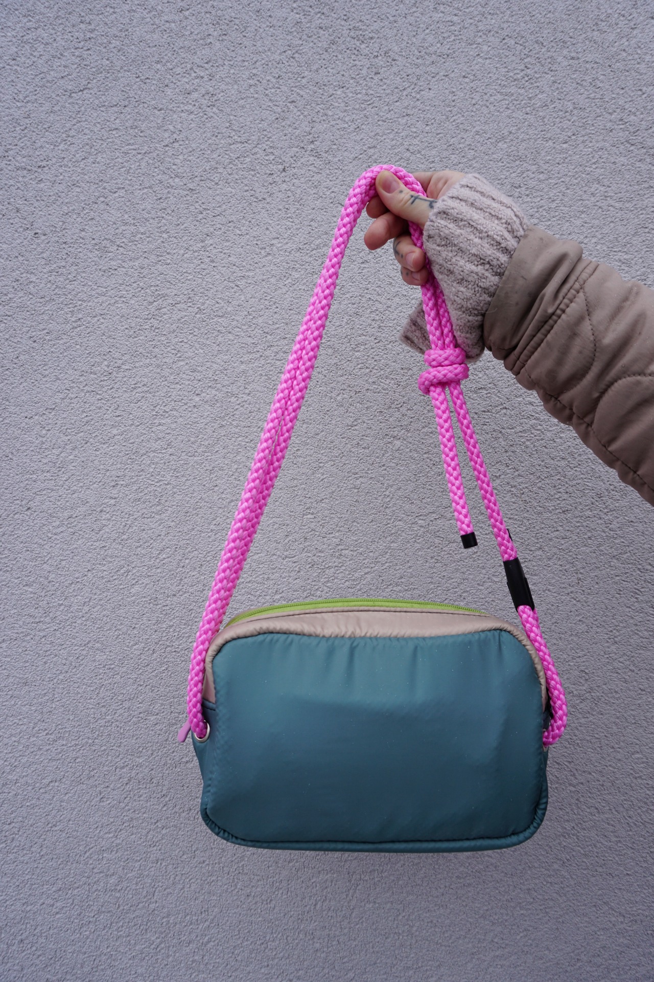 Popruh v tomto prípade nahrádza špagát v priemere 1cm, ktorý sa vďaka posuvnému uzlu dá regulovať vo svojej dĺžke.