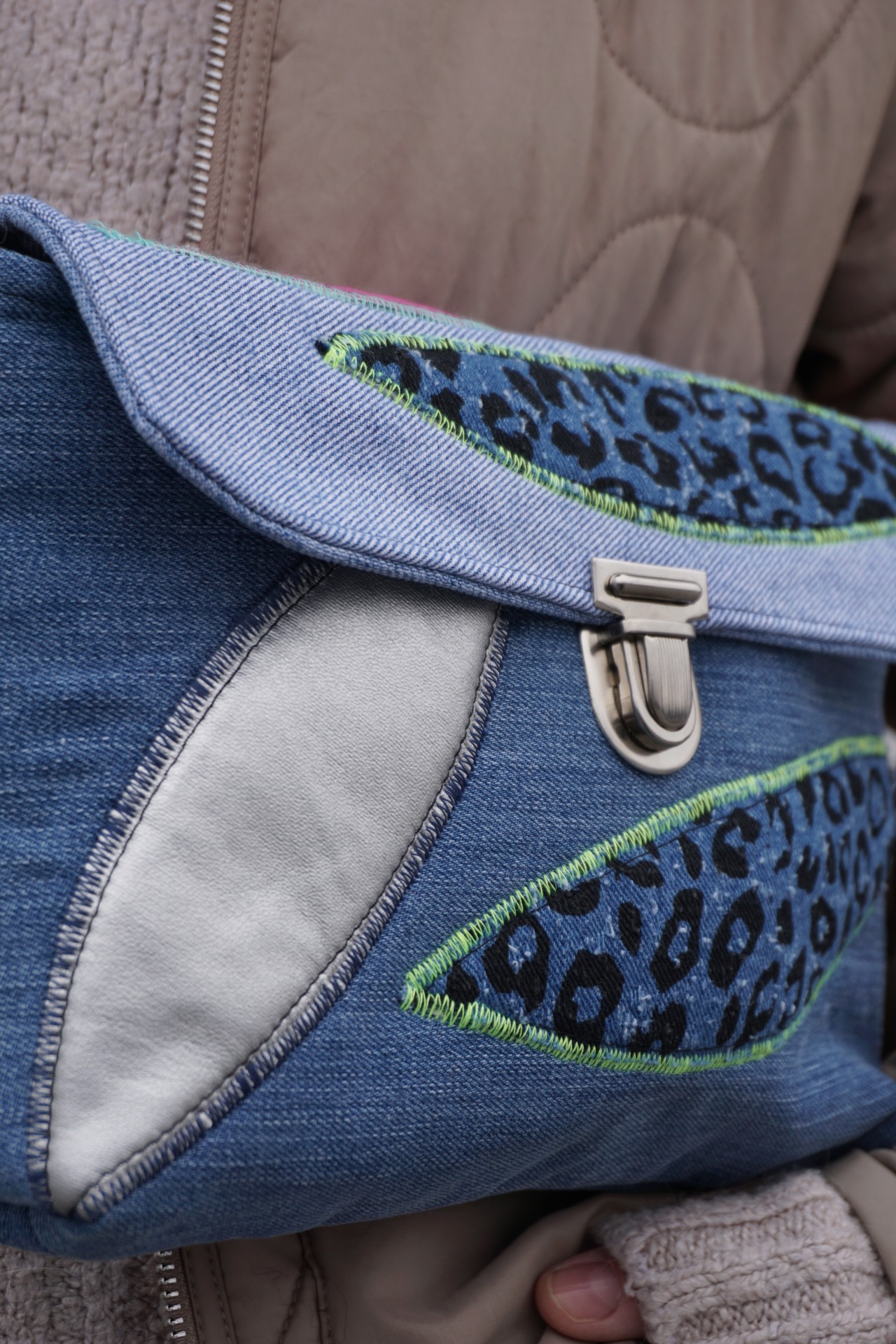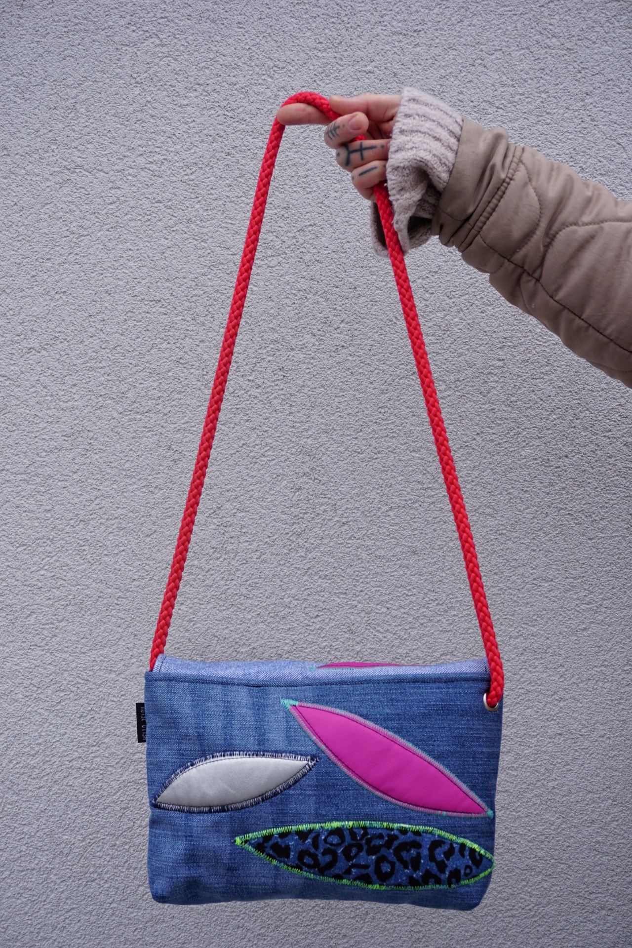 Základný materiál kabelky je denim. Vystužený, ale mäkký, na príjemné nosenie. Ariel sa tiež môže chváliť svojou originálnou nášivkou, ktorú som pripravila špeciálne pre ňu.