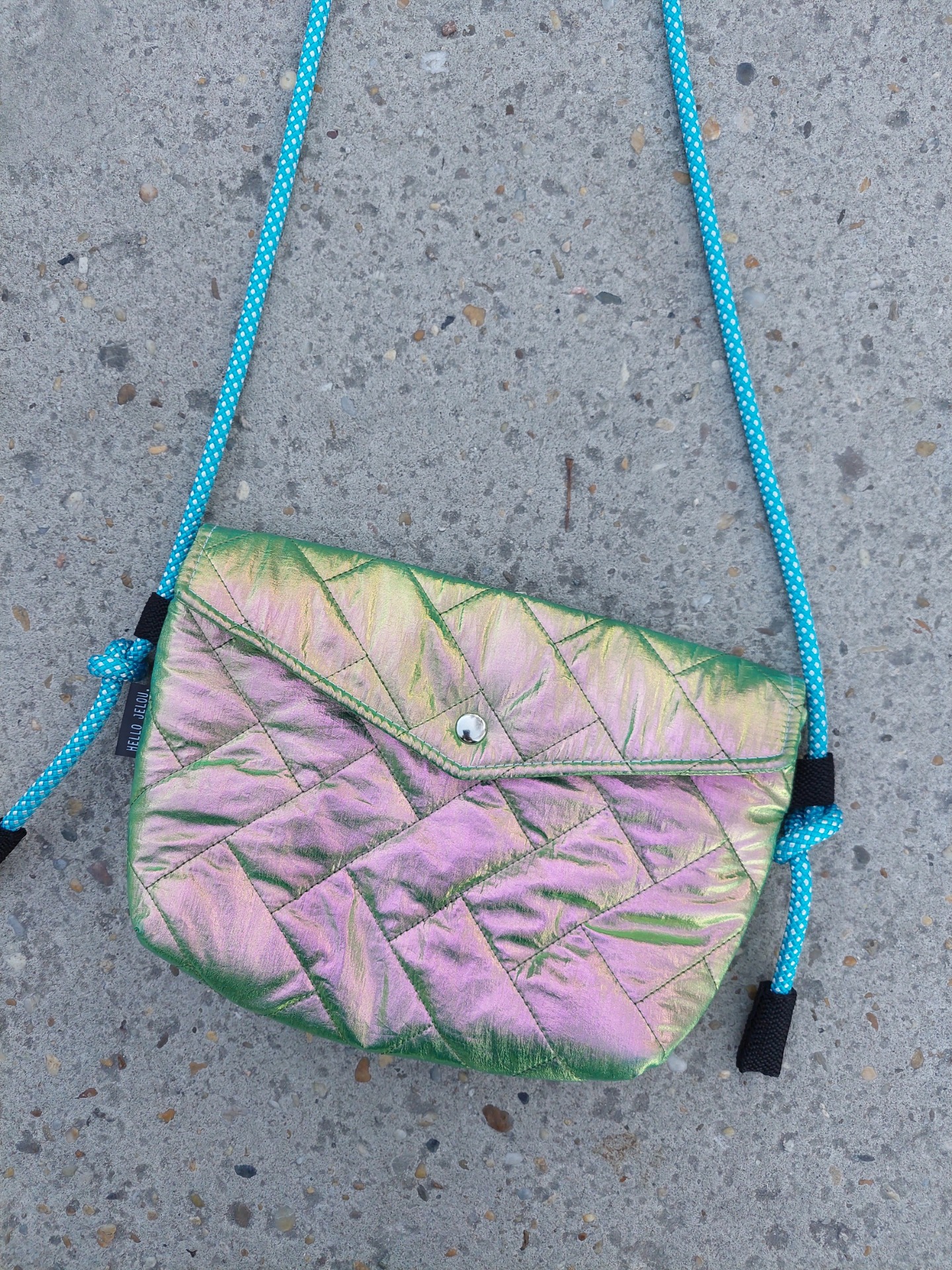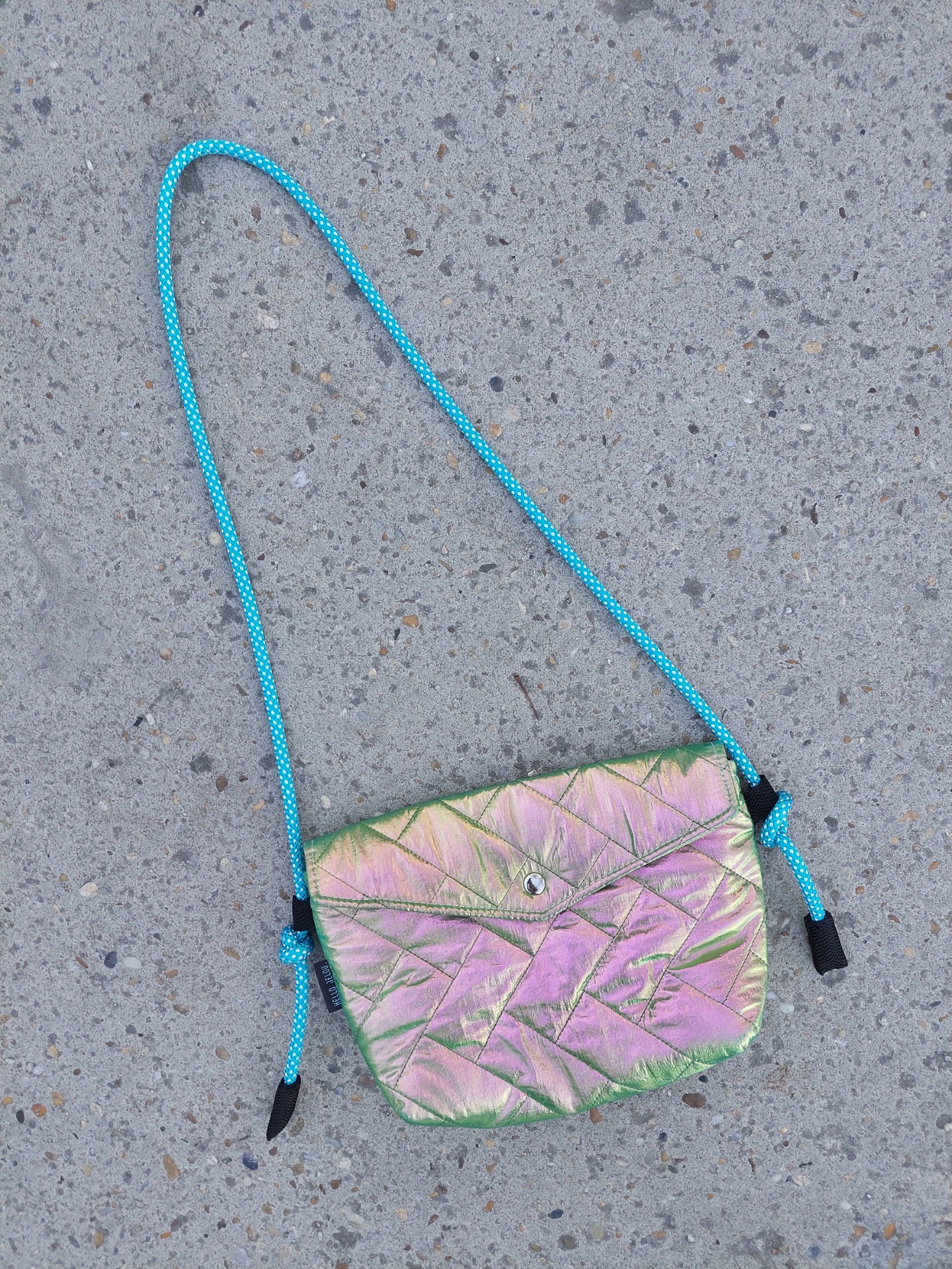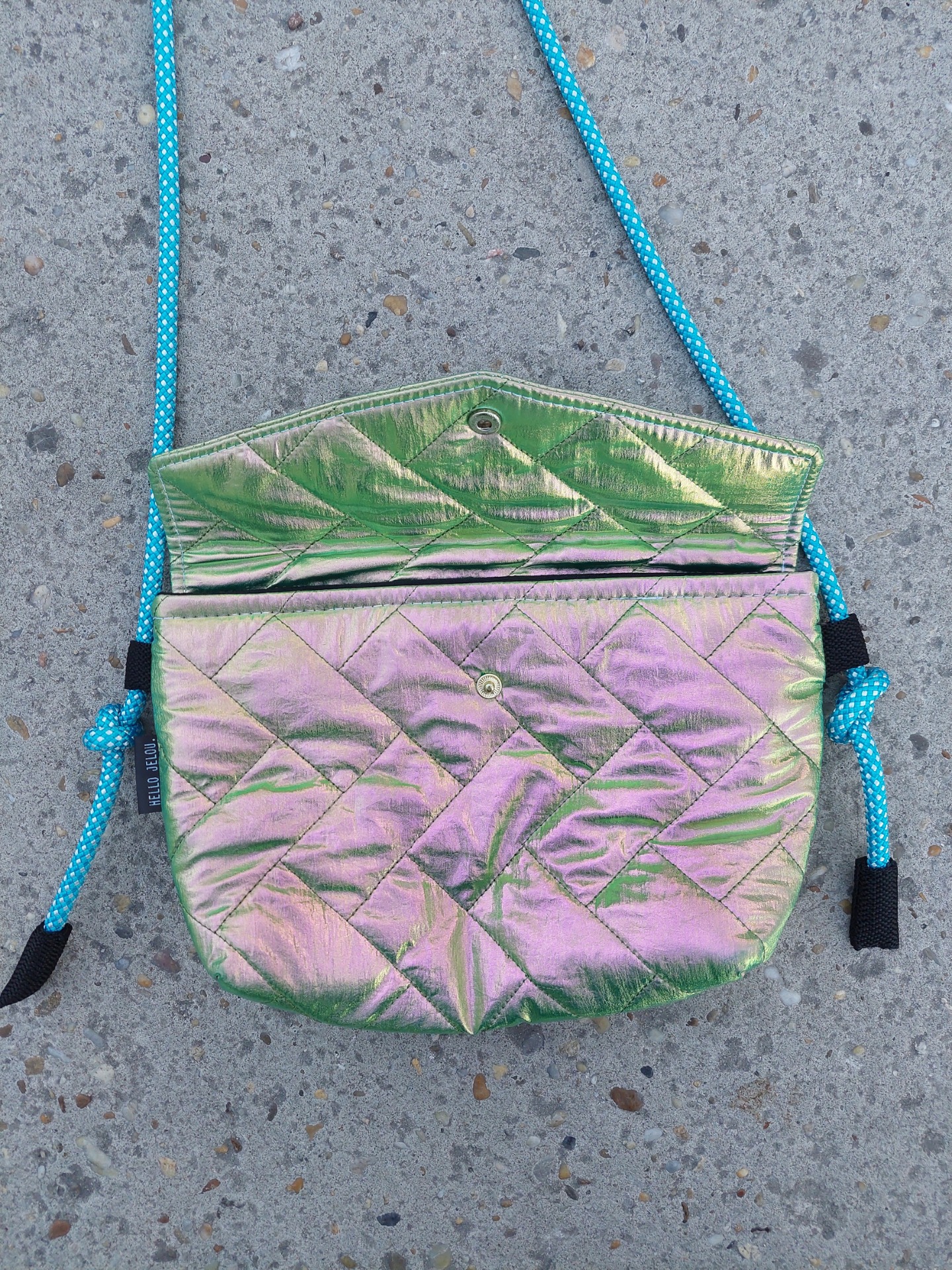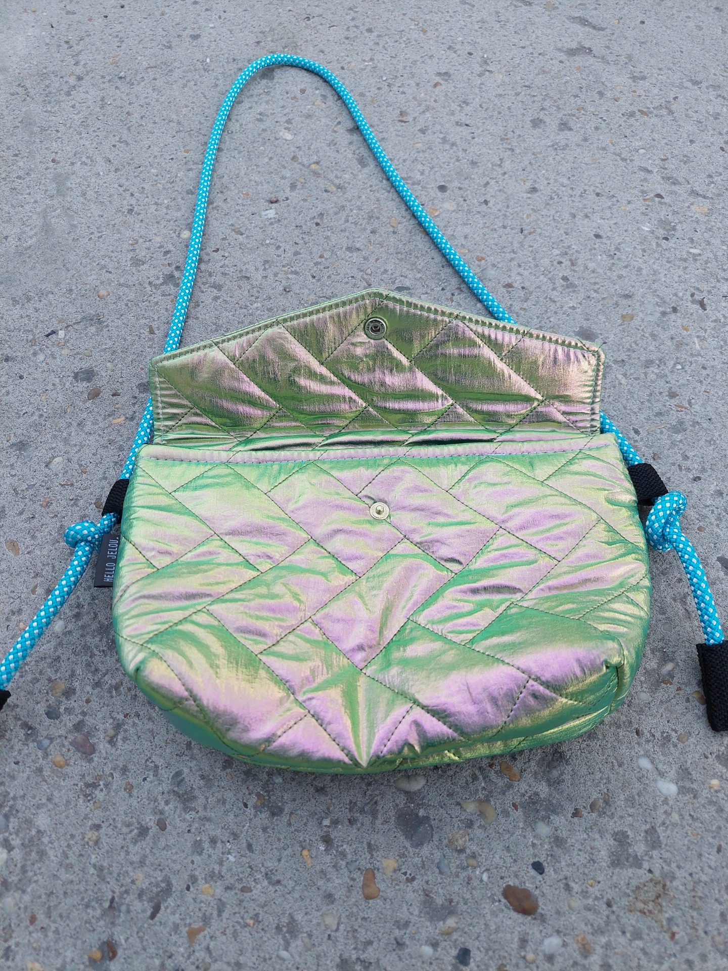 Kabelka je ušitá z prešívaného lesklého, metalického materiálu, ktorý je veľmi príjemný, prispôsobivý a z časti nepremokavý. Má jedno hlavné vrecko uzatvárateľné na kovový druk a vo vnútri ešte jedno vrecko na drobnosti - uzatvárateľné na zips. Popruh je zo syntetického špagátu, zakončený uzlami.