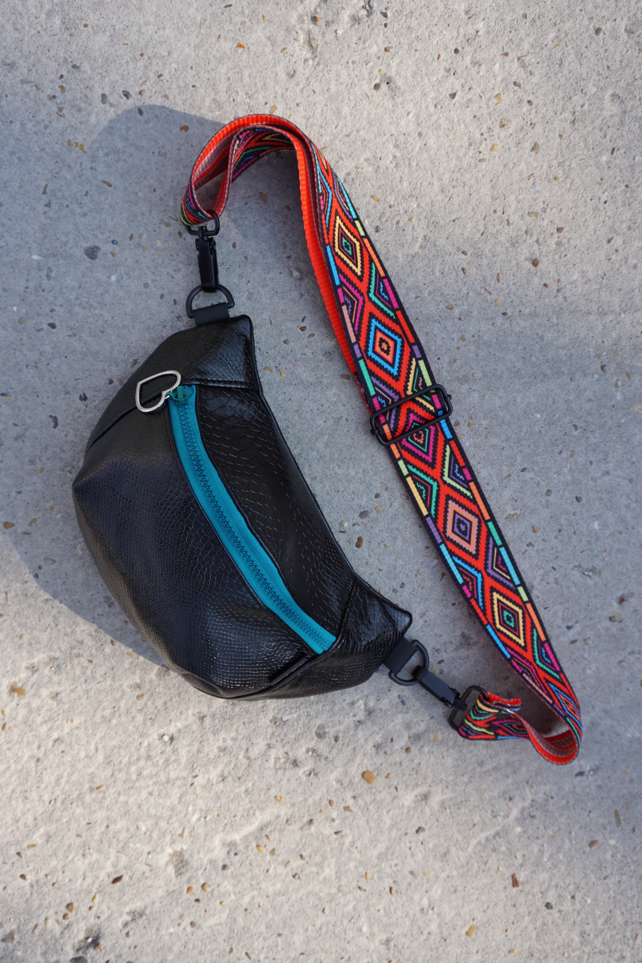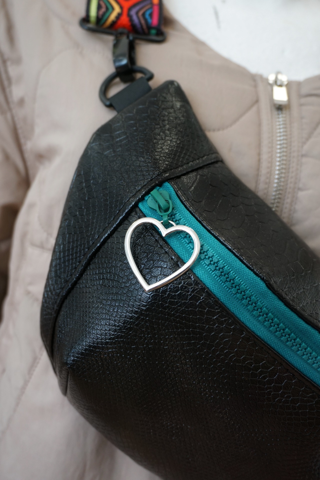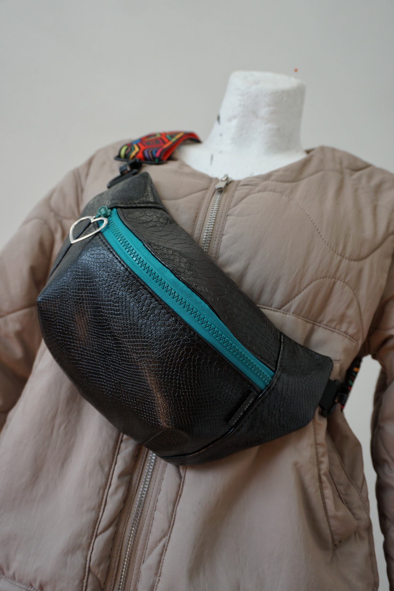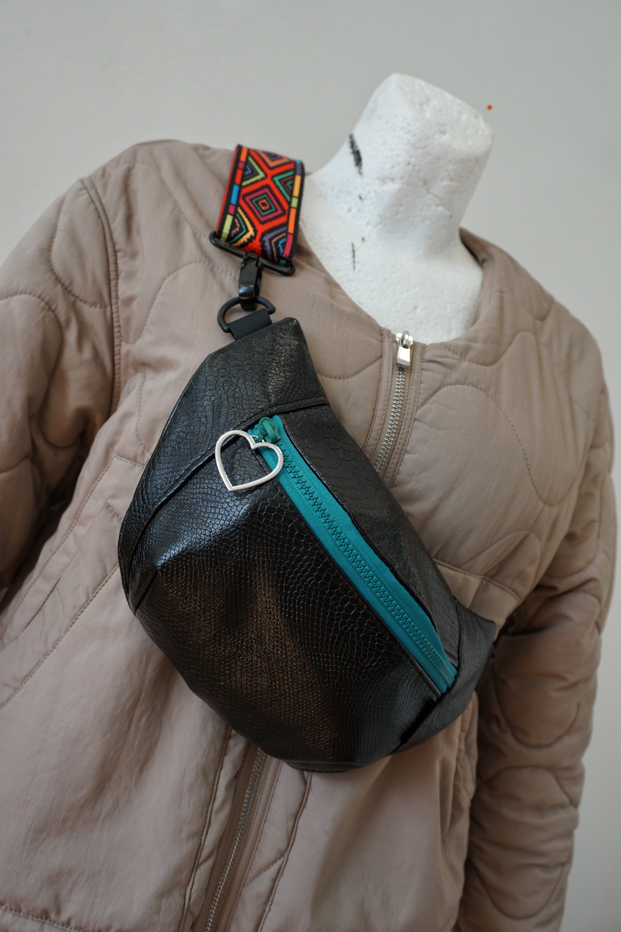 Ľadvinka je vyrobená z upcyklovaného materiálu koženky (zo starého nové). Má jedno základné vrecko a popruh v šírke 5 cm, pripevnený na karabiny.