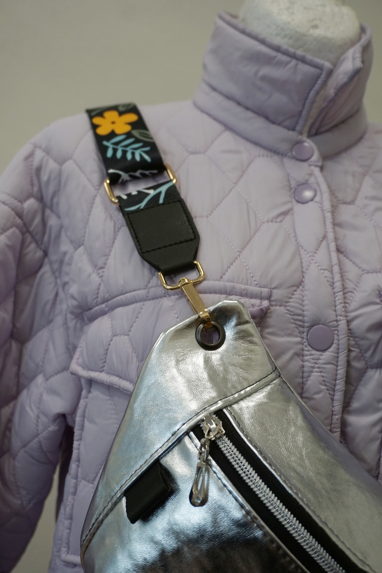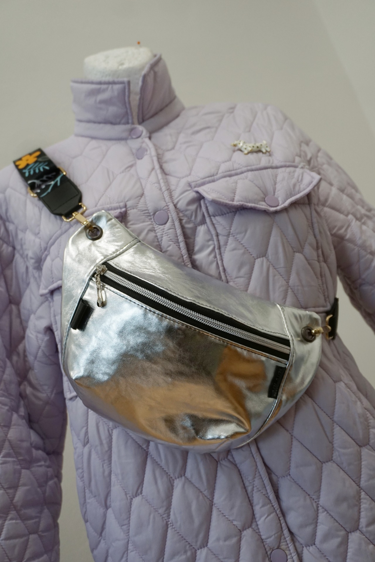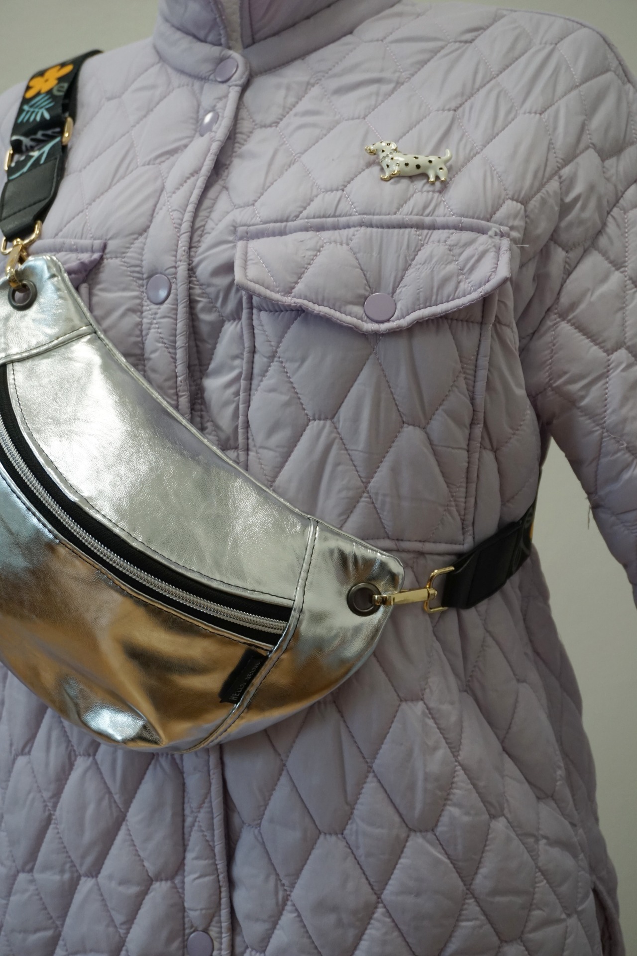 Ľadvinka je vyrobená zo stribornej koženky. Má jedno základné vrecko a popruh v šírke 4 cm, pripevnený na karabiny. ZIP je plastový.