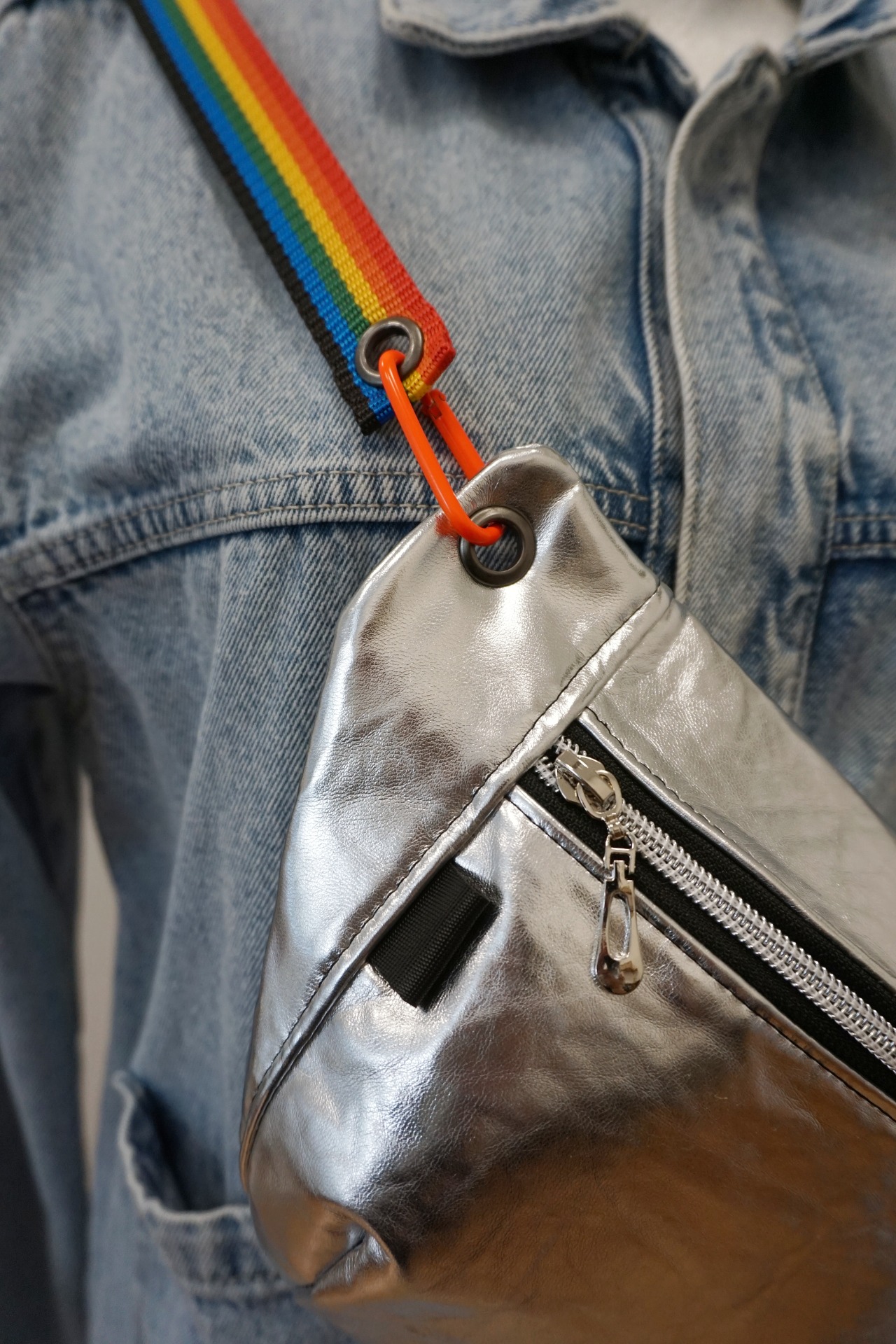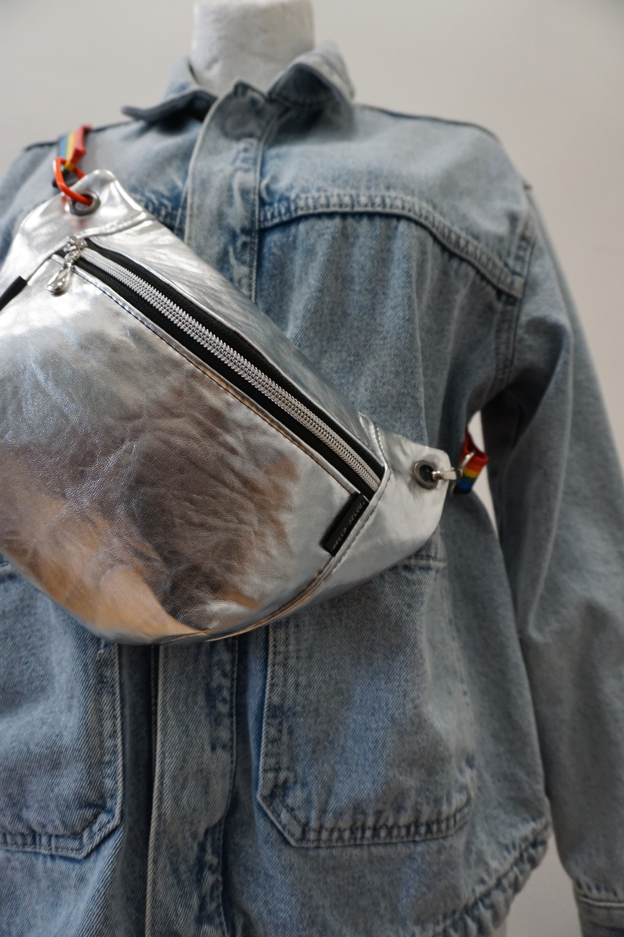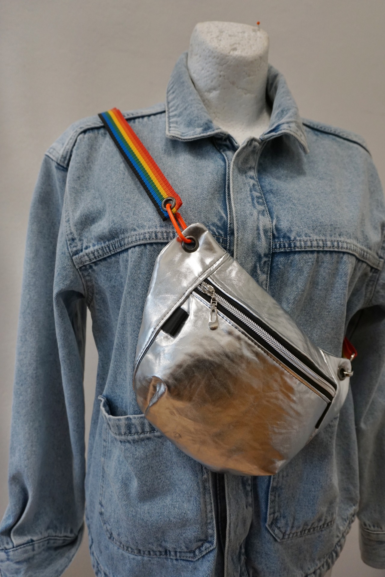 Ľadvinka je vyrobená zo stribornej koženky. Má jedno základné vrecko a popruh v šírke 2,5 cm, pripevnený na karabiny. ZIP je plastový.