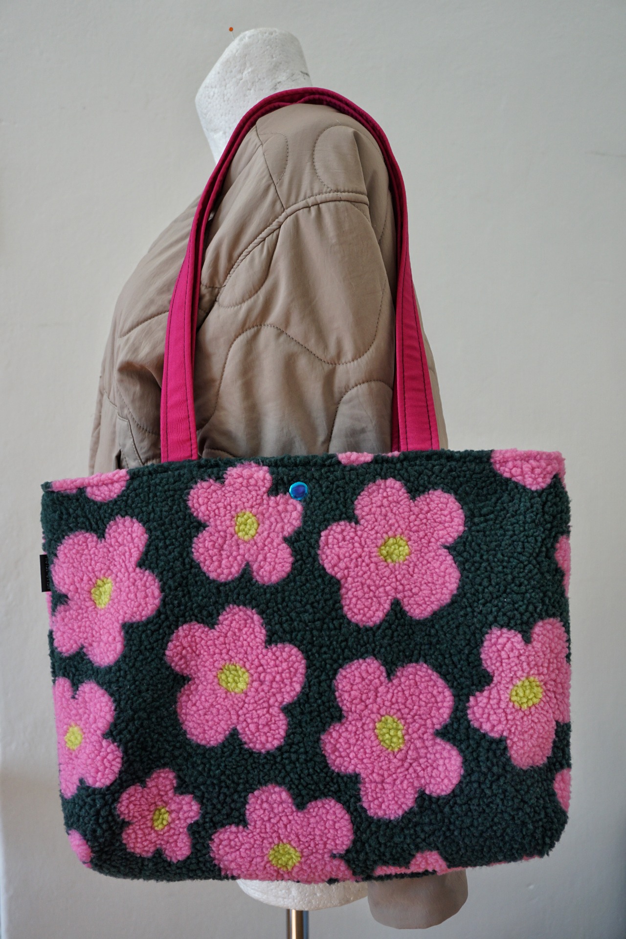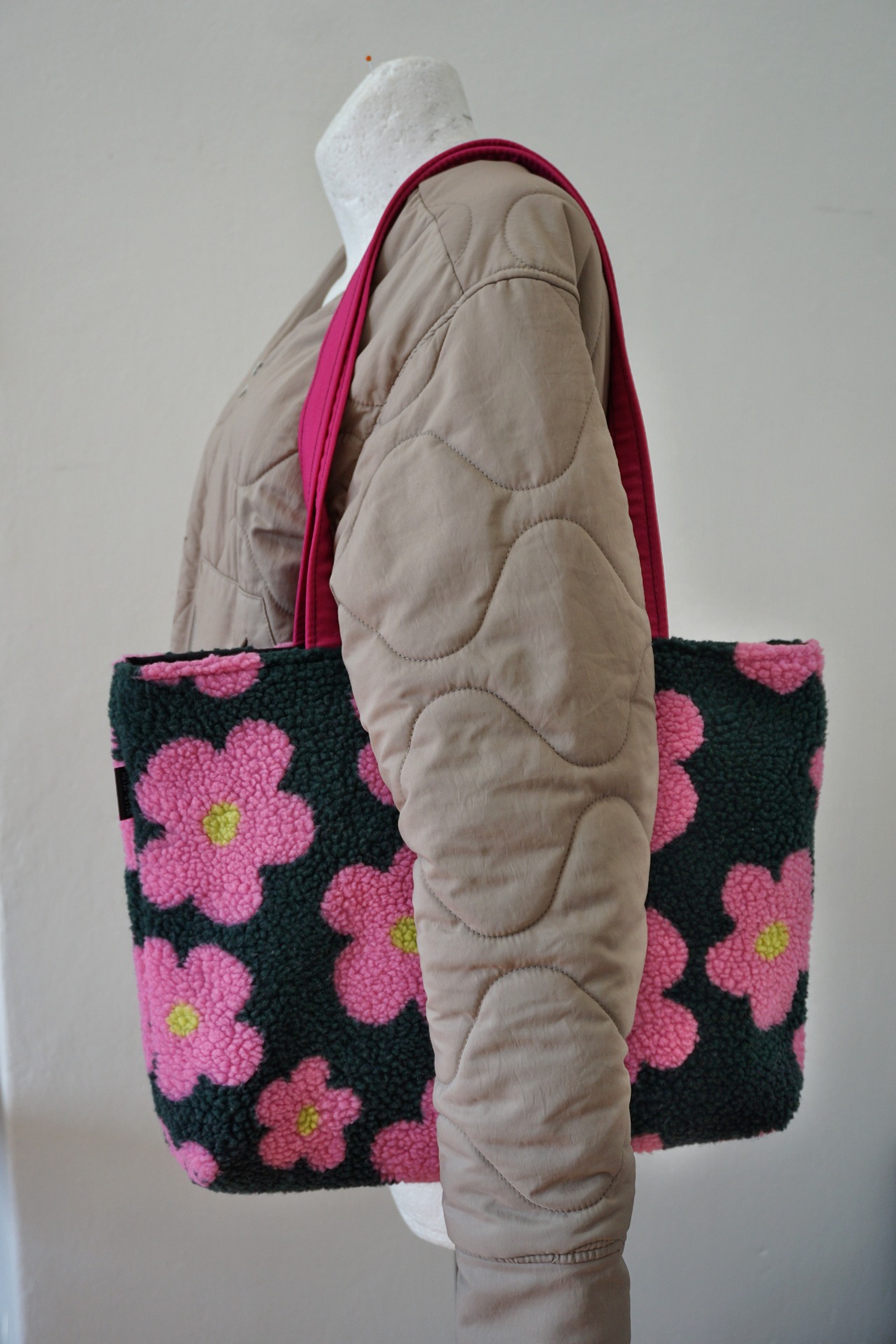 FLOWER je taška iba s jedným základným vreckom s čiernou podšívkou, uzatvárateľná na kovový cvok. Je ušitá z vystuženého materiálu fleece. Je veľmi ľahká a vhodná napríklad aj na nosenie notebooku.